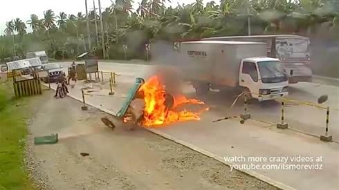 实拍 摩的逆行被大客车撞惨 爆炸燃烧