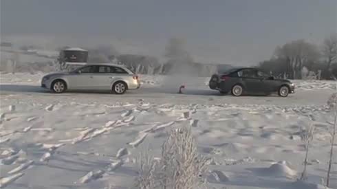 监控实拍:雪地相遇 自行车完胜小轿车...