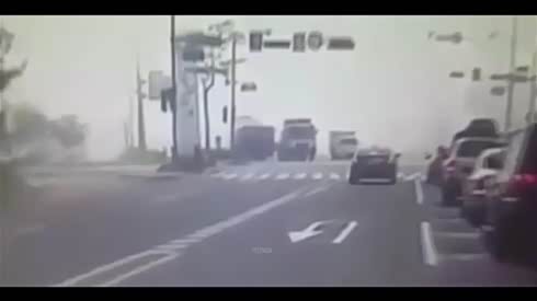 太恐怖!大货柜车司机分神 致恐怖侧翻...