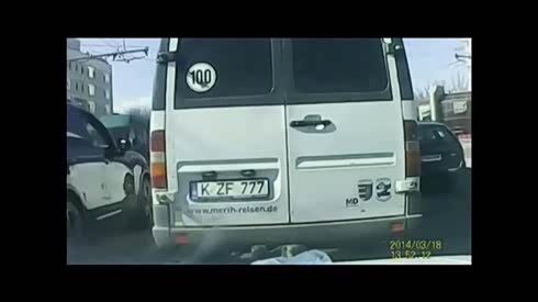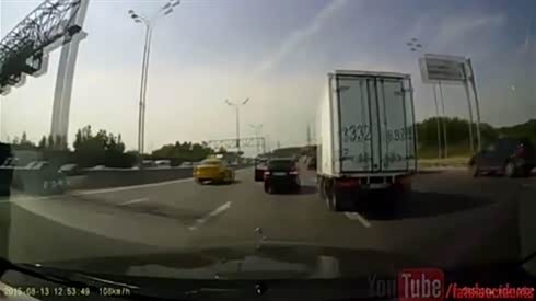 奔驰女司机强行超车 遭遇大货车夹击 差点被挤扁...