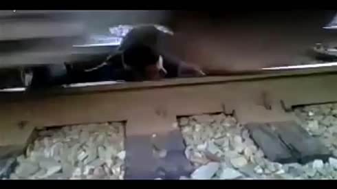 这就是在玩命!男子从行驶的火车铁轨中钻出来