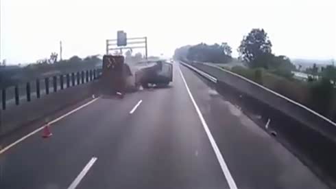 惊魂!超载大货车一脚急刹 满车钢条削平驾驶室