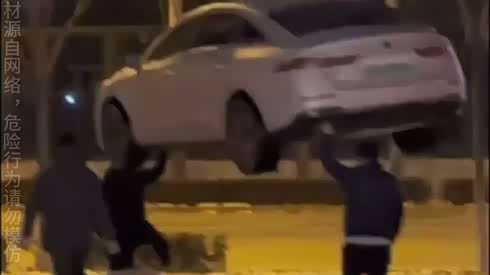 两男子单手抬“车”!网友:起猛了,眼花了?