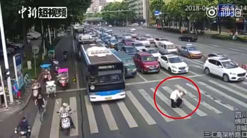 绵阳交警背大爷过街 路口车辆主动让行