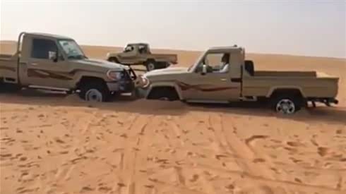 中东车友天生就疯癫 沙漠里俩车玩顶牛