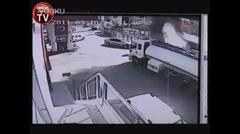 大型油罐车加油站起火爆炸 旁边轿车遭殃 太恐怖