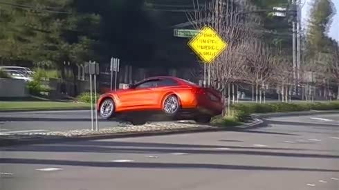 实拍得瑟宝马 BMW M4 失控翻越花坛
