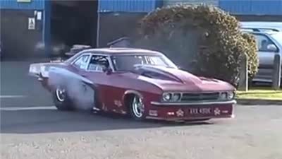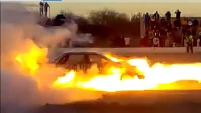 太残暴了!可怜小轿车遭火箭车喷火烘烤