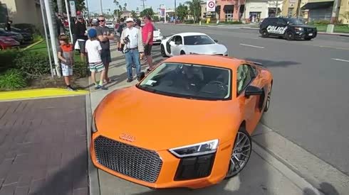 亚裔男子驾驶 街拍橙色奥迪R8 V10 plus