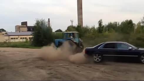 惨遭秒杀 奥迪A8和拖拉机的拔河比赛