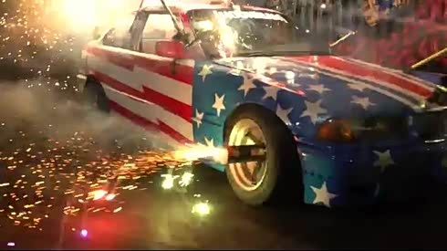 火花四溅 宝马车插满燃烧烟花烧胎漂移