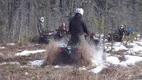 太玩命了 ATV雪后穿越森林中的泥泞路