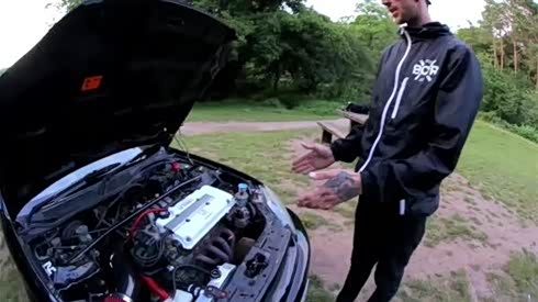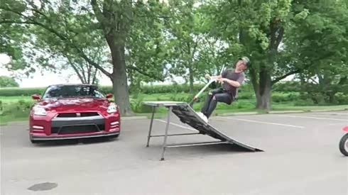 有钱就是任性!骑脚踏车飞跃日产GT-R