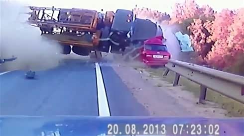 惊魂!超载大货车一脚急刹 满车钢条削平驾驶室