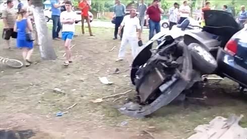 监控实拍:飞车撞击路障翻滚侧滑 恐怖一幕