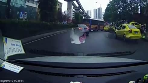 监控实拍:出租车上坡打滑 失控溜车骑上绿化带...吓尿了