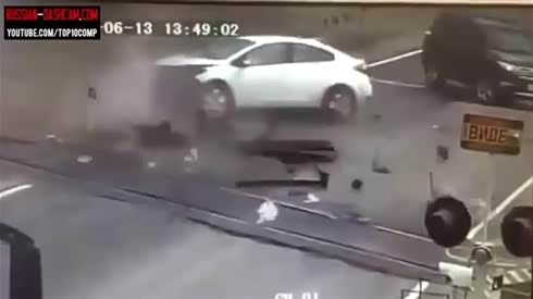 监控实拍 起重机迎面撞碎轿车 撞废大客车 翻到桥下