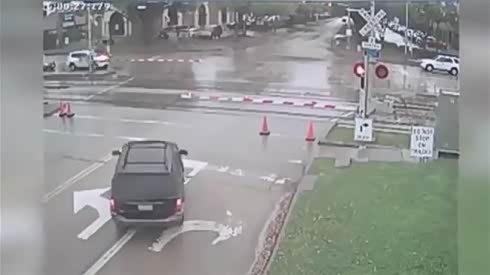 红灯还闯杆 实拍大切诺基被火车撞残废