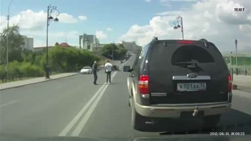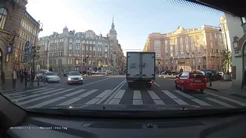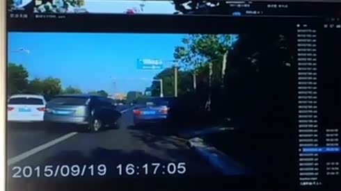 监控实拍:二货小车违章调头 致使另一小车撞上大树...