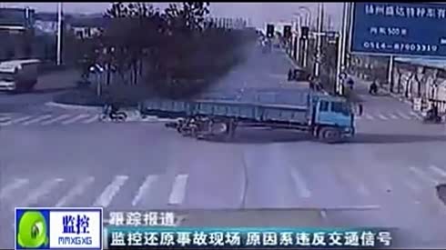 监控实拍:三轮车失控 卷入大货车后轮 太恐怖