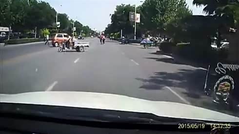 监控实拍:三轮车横穿马路 SUV紧急躲避险翻车