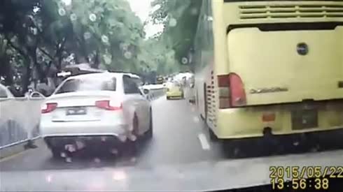 监控实拍:二货公交车司机 这得有多大的仇 把奥迪车撞得横着走