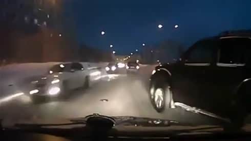 监控实拍:雪地失控 小车险被大货撕碎