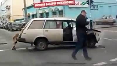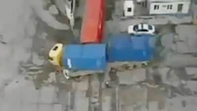 惊魂25秒!吊车钩住小汽车拖行数米