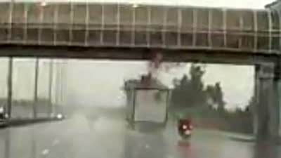 摩托车遭殃!厢式货车超高撞桥梁瞬间