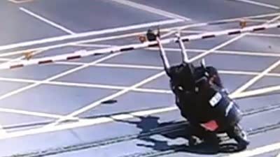 何必着急 摩托车驾驶员闯栏杆被刮倒