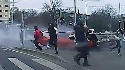 惊恐一幕 两车相撞险些横扫路边行人