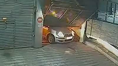 就等你伸头 悲剧轿车惨遭地库大门袭击