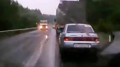 太吓人 借道超车躲闪失控惨遭卡车撞击
