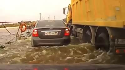 史上最无辜 轿车过浮桥遭卡车“暗算”