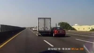 都太冲动!两车斗气致小轿车翻车撞毁