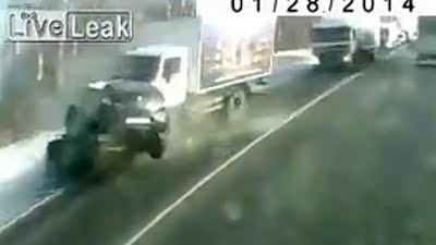 真是太惨了 大卡车迎面撞飞失控小轿车