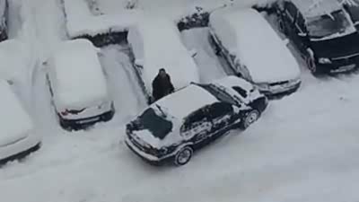 真让人崩溃 车友雪天推车失误惨撞车