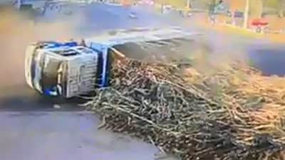 重心太高了 货车路口翻车竹子散落满地