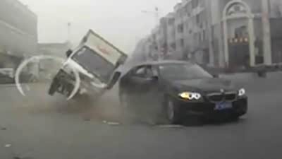 竟然没信号灯 实拍货车猛撞宝马轿车