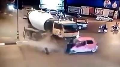 脱缰的怪兽 失控水泥罐车猛撞无辜小车