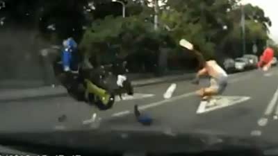 不观察/车速快 摩托车友被汽车直接掀翻