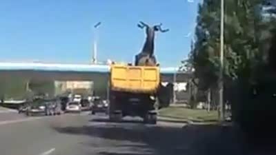 粗心惹麻烦 货车运雕像过桥洞忘记限高