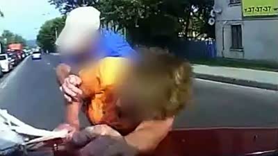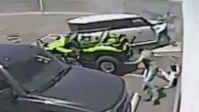 惊险的场面 摩托车摔倒又遭轿车撞击
