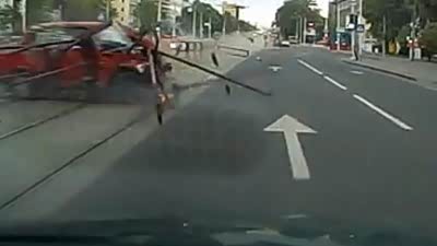 飞来横祸 暴雨突袭货车侧滑横扫车友
