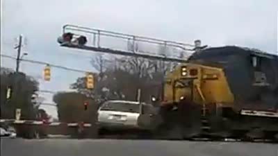 惊心动魄 汽车过铁轨抛锚被火车撞飞