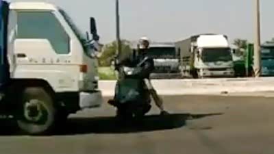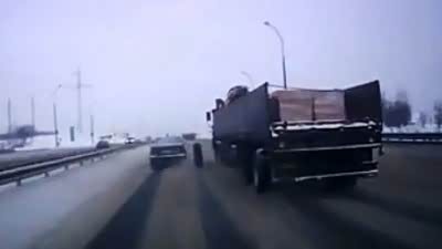 真是悲剧!卡车轮胎飞出轿车惨被砸