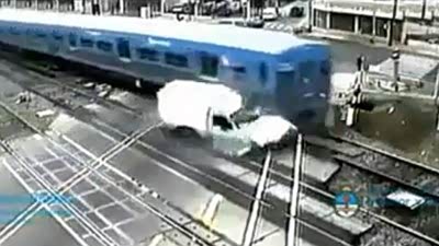 撞飞起火 皮卡铁路道口遭火车无情秒杀