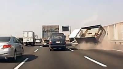 惊险瞬间 货车高速路侧翻酿追尾事故