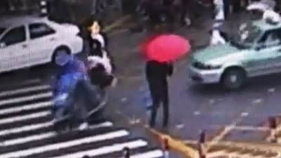突遭横祸!SUV雨天闯红灯撞翻多名行人