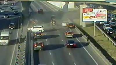 四车连撞!摩托公路摔倒引连环追尾